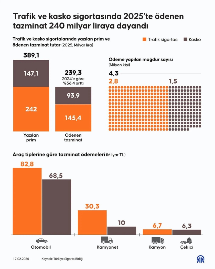 Trafik ve kasko sigortasında 2025’te 4 milyon 297 bin 994 mağdura 239,3 milyar lira tazminat ödendi.
