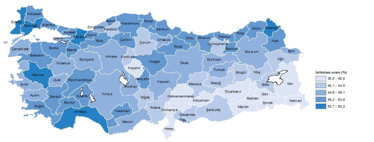 Türkiye genelinde, 2023 yılı için istihdam oranı %48,3 olarak tahmin edildi. En yüksek istihdam oranı %58,2 ile Ardahan ilinde gerçekleşti. En düşük istihdam oranı ise %35,5 ile Siirt ilinde oldu. İstihdam oranı (%), İBBS 3. Düzey, 2023