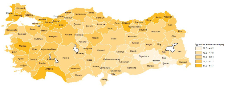 Türkiye genelinde, 2023 yılı için işgücüne katılma oranı %53,3 olarak tahmin edildi. En yüksek işgücüne katılma oranı %61,7 ile Ardahan ilinde gerçekleşti. En düşük işgücüne katılma oranı ise %38,5 ile Siirt ilinde oldu. İşgücüne katılma oranı (%), İBBS 3. Düzey, 2023