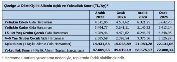 TÜRK-İŞ Konfederasyonu tarafından, çalışanların geçim koşullarını ortaya koymak ve temel ihtiyaç maddelerindeki fiyat değişikliğinin aile bütçesine yansımalarını belirlemek amacıyla her ay, düzenli olarak yapılan araştırmanın 2025 Ocak ayı sonucuna göre Ankara'da yaşayan dört kişilik bir ailenin sağlıklı, dengeli ve yeterli beslenebilmesi için yapılması gereken aylık gıda harcaması tutarı (açlık sınırı) 22.131,06 TL'ye; gıda harcaması ile giyim, konut (kira, elektrik, su, yakıt), ulaşım, eğitim, sağlık ve benzeri ihtiyaçlar için yapılması zorunlu diğer aylık harcamalarının toplam tutarı ise (yoksulluk sınırı) 72.088,14 TL'ye; bekâr bir çalışanın 'yaşama maliyeti' de aylık 28.756,29 TL 'ye yükseldi.
