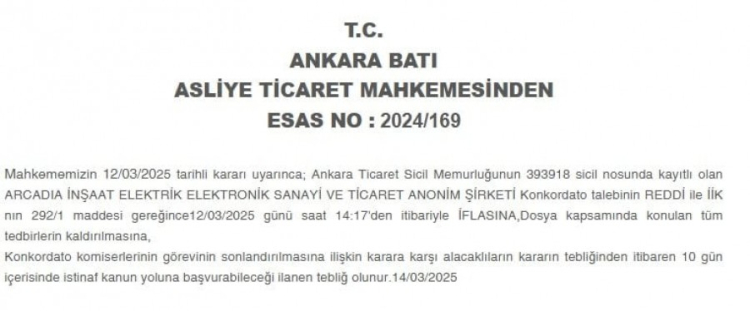 Ankara merkezli faaliyet yürüten Arcadia İnşaat, mahkeme kararıyla iflas etti. 2024'te 1 yıl süreyle kesin mühlet kararı alan şirketin yaptığı son konkordato başvurusu reddedildi.