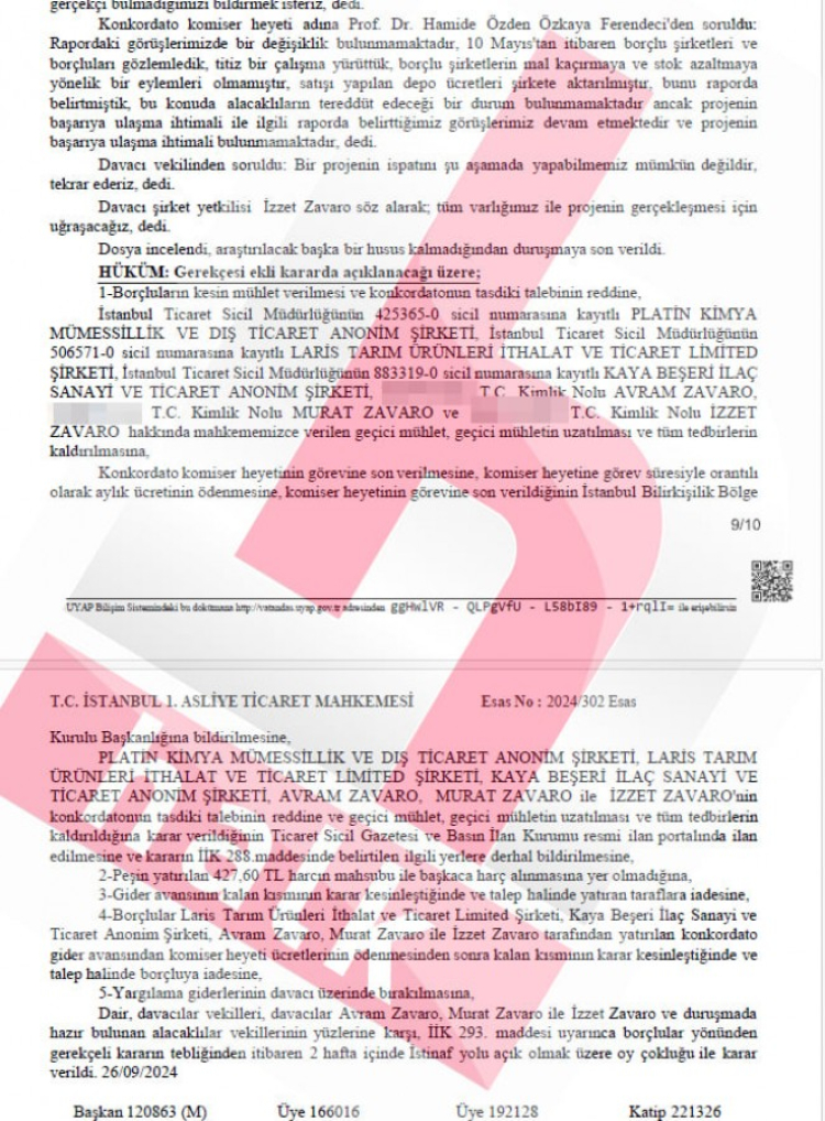 Tarım sektörünün güçlü oyuncularından Platin Kimya Mümessillik ve Dış Ticaret AŞ, Laris Tarım Ürünleri İthalat ve Ticaret Ltd. Şti ve Kaya Beşeri İlaç Sanayi ve Ticaret AŞ ile bu üç şirketin sahipleri Murat Zavaro, İzzet Zavaro ve Avram Zavaro adına geçen aylarda konkordato talebinde bulunulmuştu.