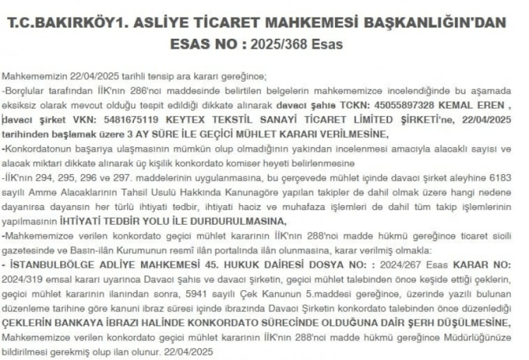 Bakırköy 1. Asliye Ticaret Mahkemesi, mali darboğaza giren şirketin başvurusunun ardından Keytex Tekstil hakkında 3 aylık geçici mühlet kararı aldı.