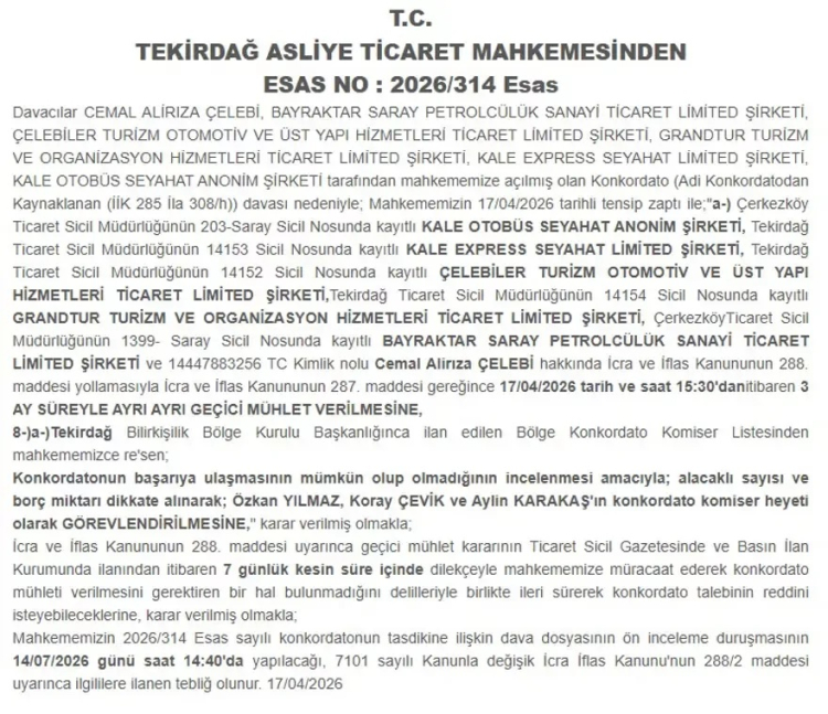 Tekirdağ merkezli ulaşım devi Kale Seyahat ve bünyesindeki altı şirket için mahkemeden kritik bir karar çıktı. Ticari faaliyetlerini koruma altına almak isteyen grup şirketlerine, mali tabloların incelenmesi ve borçların yapılandırılması amacıyla 3 ay süreyle geçici konkordato mühleti tanındı.