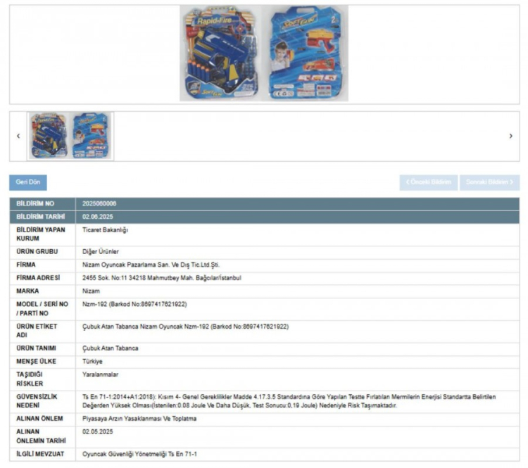GÜBİS'e giren çocuk oyuncakları arasında, çubuk atan tabancaların fırlattığı mermilerin enerji seviyesinin standartların üzerinde olduğu tespit edildi. Bu durum, çocukların güvenliği açısından ciddi bir risk oluşturuyor. Listeye eklenen bir diğer oyuncak ise yap-boz oldu. Bu yap-bozun toplatılmasının ve piyasaya arzının yasaklanmasının nedeni olarak, ambalajlamanın yasal düzenlemelere uygun olmaması gösterildi.