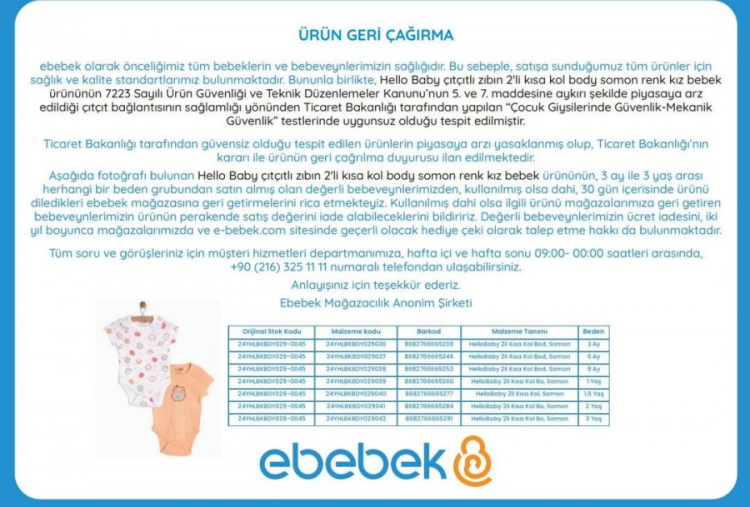 Yapılan açıklamada, Ticaret Bakanlığı kararıyla ürünün piyasaya arzının yasaklandığı ve geri çağırma duyurusunun ilan edildiği belirtildi. Ebebek, aşağıda fotoğrafı bulunan "Hello Baby çıtçıtlı zıbın 2'li kısa kol body somon renk kız bebek" ürününü, 3 ay ile 3 yaş arası herhangi bir beden grubundan satın almış olan müşterilerinden, kullanılmış olsa dahi 30 gün içerisinde ürünü diledikleri ebebek mağazasına geri getirmelerini rica etti. Müşterilerin, ilgili ürünü mağazalara geri getirmeleri halinde ürünün perakende satış değerini iade alabilecekleri veya iki yıl boyunca mağazalarında ve e-bebek.com sitesinde geçerli olacak hediye çeki olarak talep etme hakkına sahip oldukları duyuruldu.