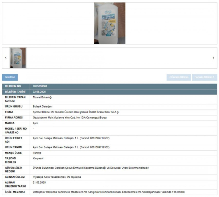 Öte yandan AYM markalı bulaşık deterjanında da çocuk emniyet kapağının bulunmaması ve dokunsal uyarının tespi edilemediği ifade edildi. Alcouble markalı genel temizleyici üründe ise yönetmeliğe uygun paketlenmemesi nedeniyle piyasa arzının yasaklanmasına ve toplatılmasına karar verildi.