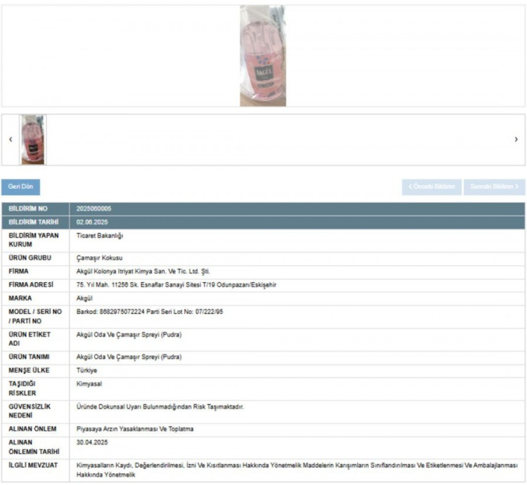 Ticaret Bakanlığı'nın en dikkat çekici ürünü ise Eskişehir Odunpazarı ilçesinde üretilen Akgül markalı "Akgül Oda ve Çamaşır Spreyi" oldu. Ürün için yapılan denetimlerde kimyasal riski dikkat çekti. Ayrıca, "Üründe Dokunsal Uyarı Bulunmadığından Risk Taşımaktadır" ifadeleri kullanıldı.