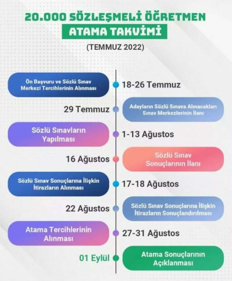 Milli Eğitim Bakanı Mahmut Özer, 20 bin sözleşmeli öğretmen atama takvimine göre adayların ön başvuru ve sözlü sınav merkezi tercihlerinin 18-26 Temmuz 2022 tarihleri arasında alınacağını söyledi.