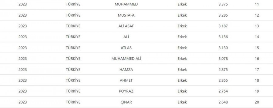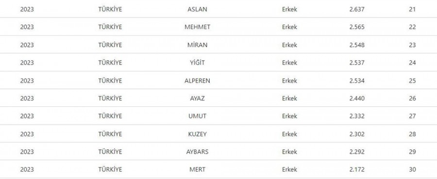 Türkiye'nin en popüler erkek - kız bebek isimleri belli oldu. İlk 30 ismi paylaşan TÜİK; "Adrese Dayalı Nüfus Kayıt Sistemi verilerine göre, seçilen yıl içerisinde doğmuş olan bebeklere en çok verilen ilk 30 isim listelenmektedir. İsimler yıla ve cinsiyete göre değişmektedir." ifadelerini kullandı.