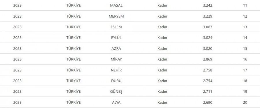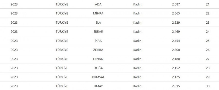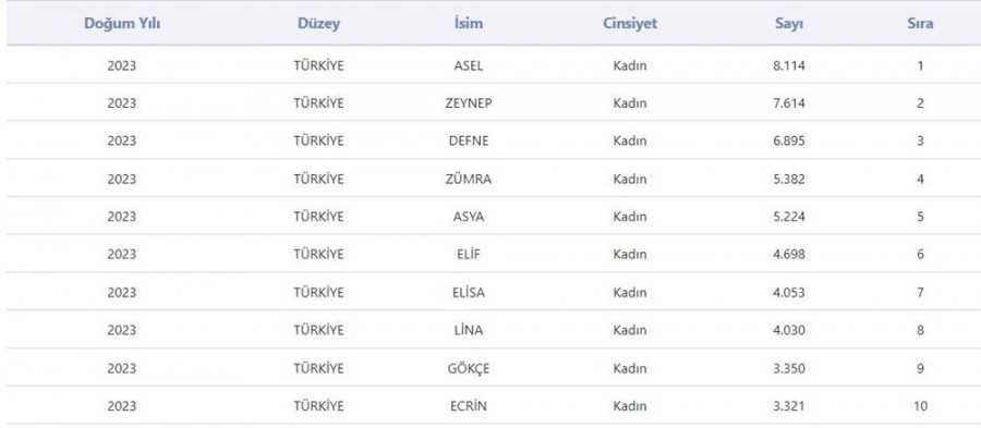 Kız bebeklerde Asel, Zeynep ve Defne isimlerini sırasıyla Zümra, Asya, Elif, Elisa, Lina ve Gökçe takip etti.