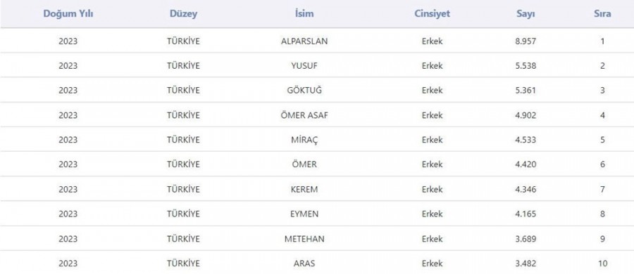 Bu isimleri sırasıyla Ömer Asaf, Miraç, Ömer, Kerem, Eymen ve Metehan takip etti. Kız bebeklere en çok verilen isimler arasında ilk sırayı ise Asel aldı.
