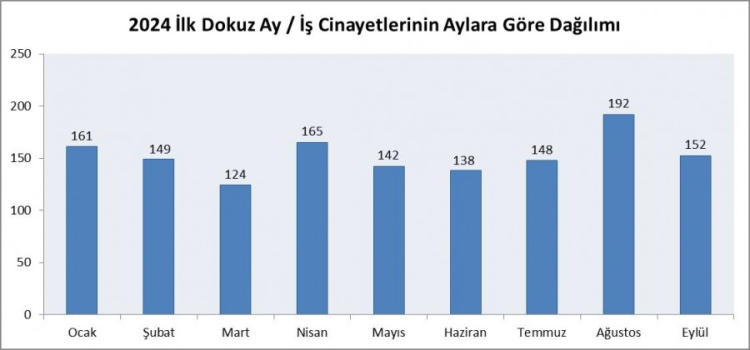 2024 yılının ilk dokuz ayında iş kazalarının aylara göre (güncellenmiş) dağılımı şöyle:
