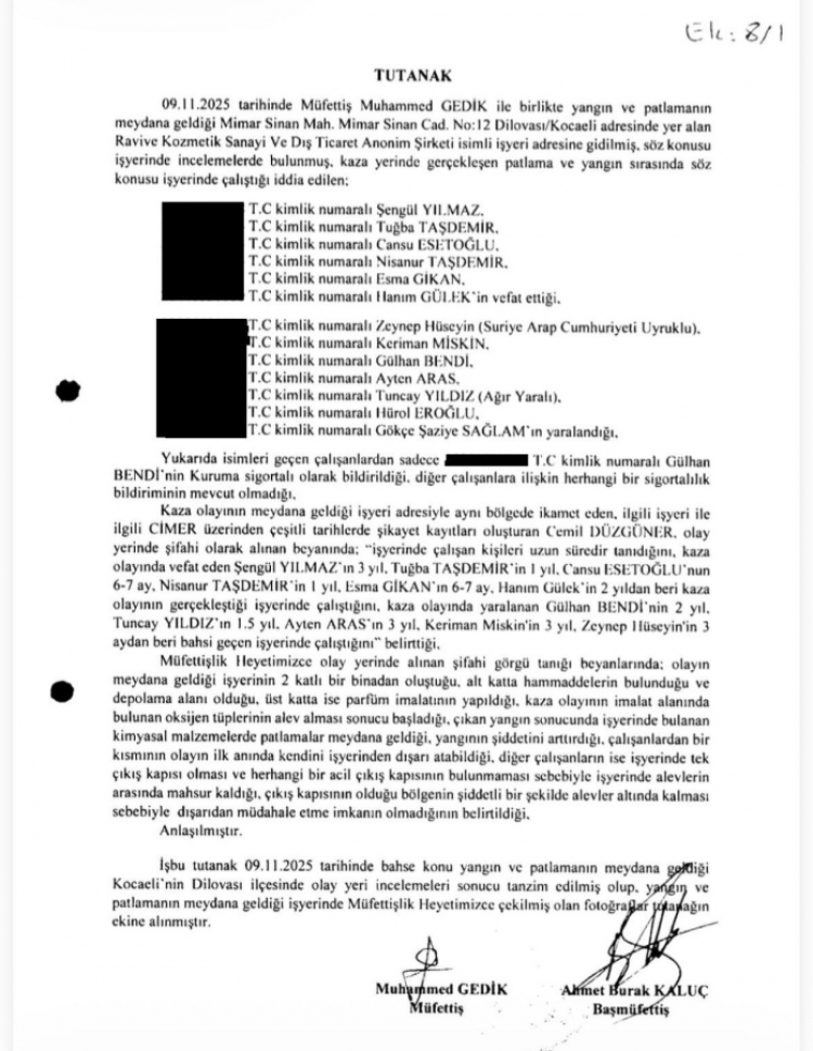 Dilovası ilçesinde 7 işçinin yaşamını yitirdiği kozmetik fabrikasındaki yangına ilişkin hazırlanan müfettiş raporu, işletmede hem itfaiye uygunluk onayı hem de yapı-iskan belgesi olmadan üretime başlandığını ortaya koydu.