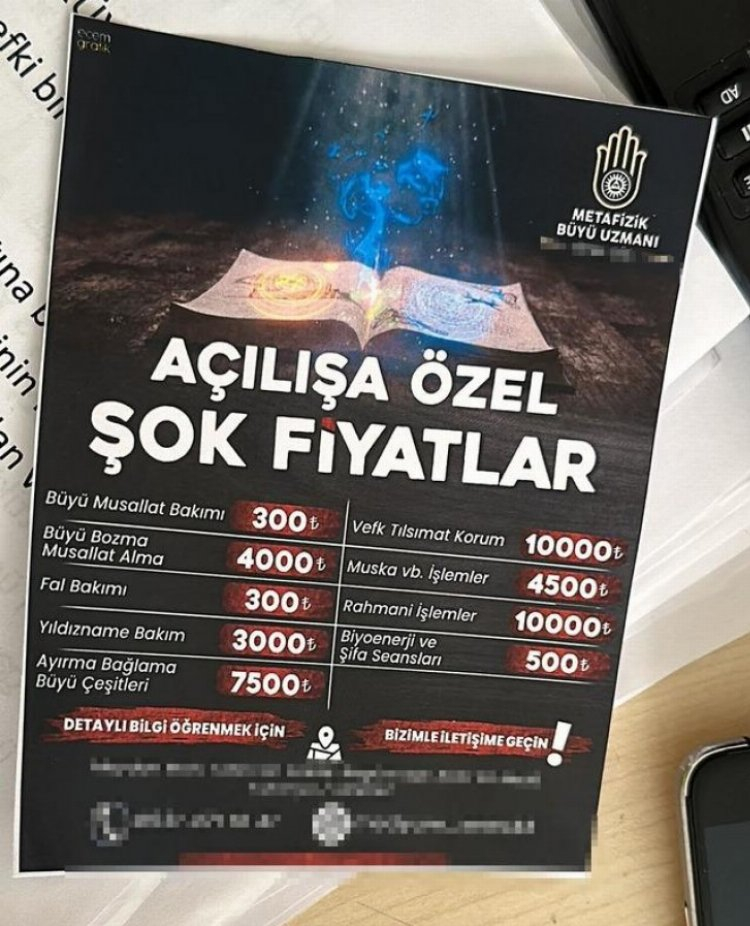 Broşürde; büyü musallat bakımı 300 lira, büyü bozma 4 bin lira, fal bakımı 300 lira, yıldızname 3 bin lira, ayırma-bağlama büyü çeşitleri 7 bin 500 lira, muska vb. işlemler 4 bin 500, rahmani işlemler 10 bin lira, biyoenerji ve şifa seansları için de 500 lira fiyat belirlediği görüldü.