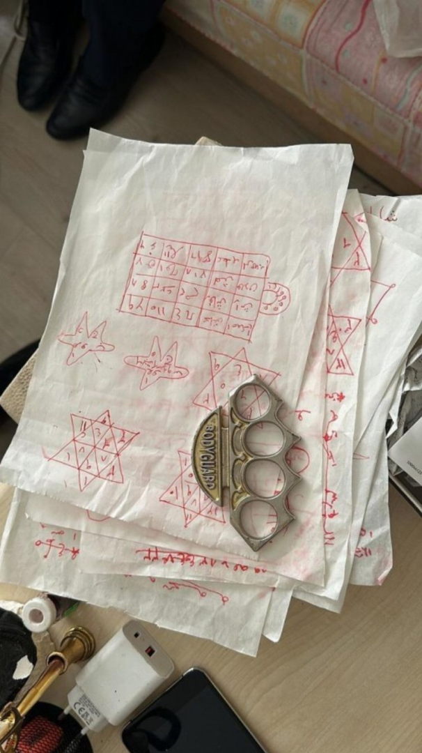 Evlerde yapılan aramalarda; 200 muska, çeşitli sembollerin bulunduğu çerçeveli resimler, Arapça yazılı ve çeşitli sembollerin bulunduğu bez parçaları, alacak-verecek miktarlarının yazılı olduğu çeşitli ajandalar ile büyü ve muska yapımında kullanılan materyaller ele geçirildi.