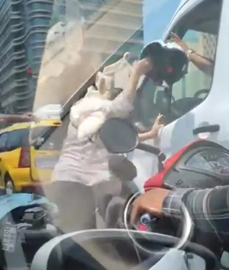 Adana'da kadın motosiklet sürücüsü trafikte kendini sıkıştırdığını iddia ettiği kamyonet şoförüne kaskıyla vurmaya çalıştı.