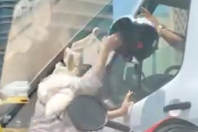 Motosikletten inen sürücü eline aldığı kaskıyla kamyon şoförüne vurmaya çalıştı.