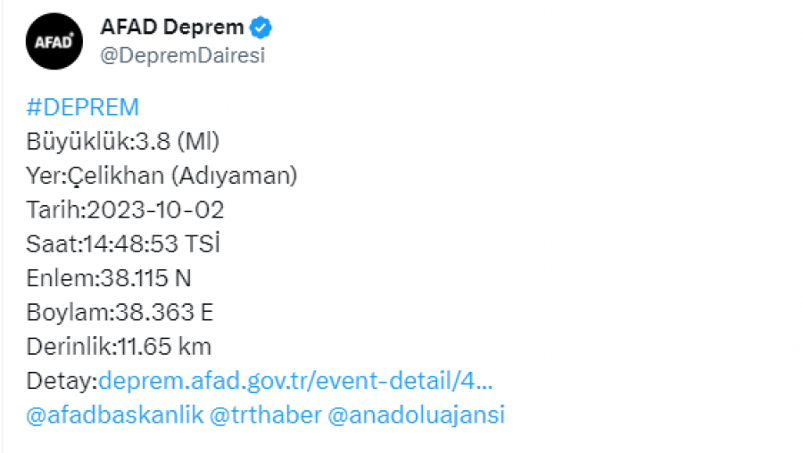 AFAD'dan yapılan açıklamada Adıyaman'ın Çelikhan ilçesinde 3.8 büyüklüğünde bir deprem meydana geldiği bildirildi.