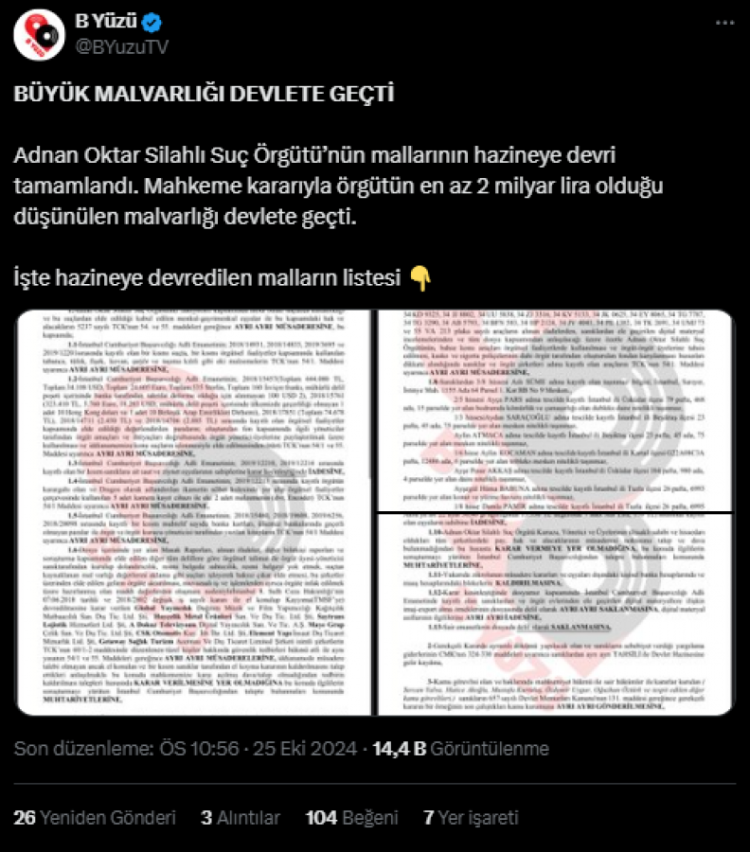 BYuzuTv'den alınan bilgilere göre; Yaşanan süreçlerin ardından Adnan Oktar Silahlı Suç Örgütü'nün mallarının hazineye devri tamamlandığı belirtildi. Mahkeme kararıyla örgütün en az 2 milyar lira olduğu düşünülen malvarlığı devlete geçti.