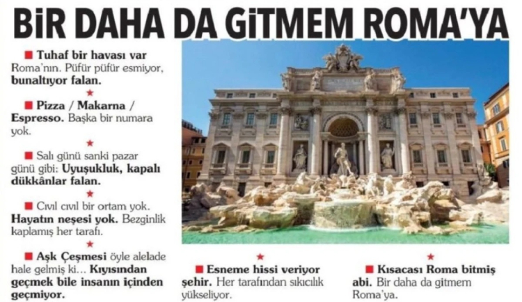 Bezginlik kaplamış her tarafı. Aşk Çeşmesi öyle alelade hale gelmiş ki... Kıyısından geçmek bile insanın içinden geçmiyor. Esneme hissi veriyor şehir. Her tarafından sıkıcılık yükseliyor. Kısacası Roma bitmiş abi. Bir daha da gitmem Roma’ya"