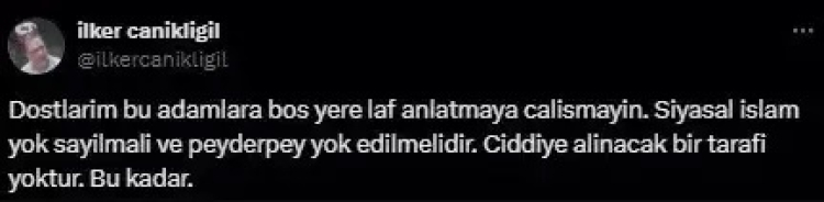 Canikligil, ayrıca sosyal medya hesabından da, "Dostlarım, bu adamlara boş yere laf anlatmaya çalışmayın. Siyasal İslam yok sayılmalı ve peyderpey yok edilmeli. Ciddiye alınacak bir tarafı yoktur. Bu kadar" paylaşımında bulunmuştu.