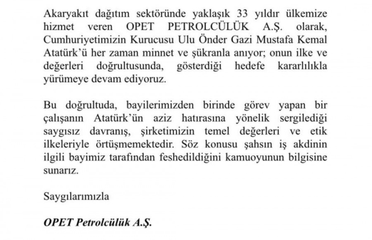 Sosyal medyada paylaşılan bir videoda Bursa'da da şubeleri olan akaryakıt istasyonunda çalışan bir kişinin Mustafa Kemal Atatürk'e küfür ettiği yer alıyordu. Opet'te çalışan kişi işten kovuldu. Konuyla ilgili açıklama geldi.