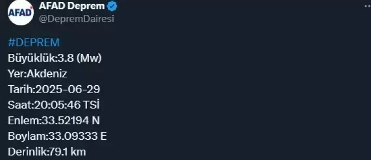 İçişleri Bakanlığı Afet ve Acil Durum Yönetimi Başkanlığı (AFAD) Akdeniz'de 3.8 büyüklüğünde deprem meydana geldiğini bildirdi.