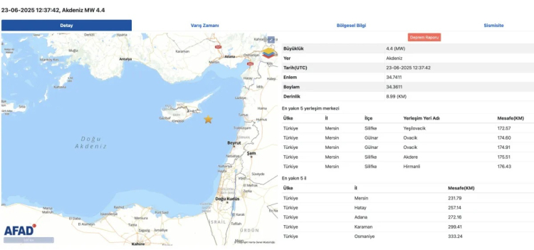 İçişleri Bakanlığı Afet ve Acil durum Yönetimi Başkanlığı'nın (AFAD) bildirdiğine göre, Akdeniz'de gerçekleşen deprem Mersin ve ilçelerinden hissedildi.