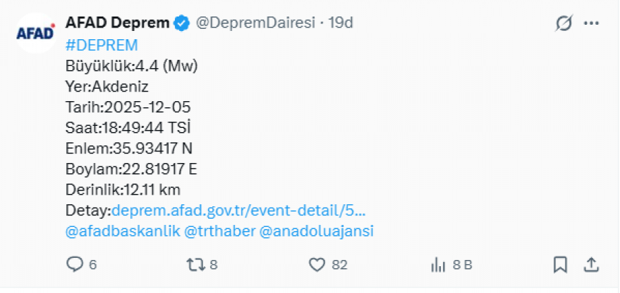 AFAD açıklamasına göre deprem yerin 12.11 kilometre altında meydana geldi.