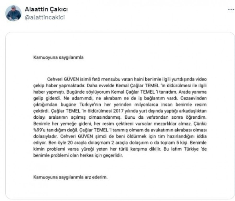 Kemal Çağlar Temel'in Yeraltı dünyasının tanınan isimlerinden Alaattin Çakıcı, İstanbul Poyrazköy'de yemek yerken fotoğrafları da ortaya çıkmıştı. Çağlar'ın öldürülmesinin ardından Çakıcı'nın da öldürüleceği iddia edildi. Alaattin Çakıcı bu iddia üzerine açıklama yaptı.