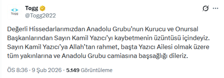 Aynı zamanda TOGG hissedarı olan Yazıcı için yayımlanan başsağlığı mesajında şu ifadeler kullanıldı: