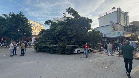 Antalya'da kökünden kopan 30 yıllık ağaç, park halindeki 5 otomobilin üzerine devrildi. Olayda yaralanan olmazken, araçlarda hasar oluştu