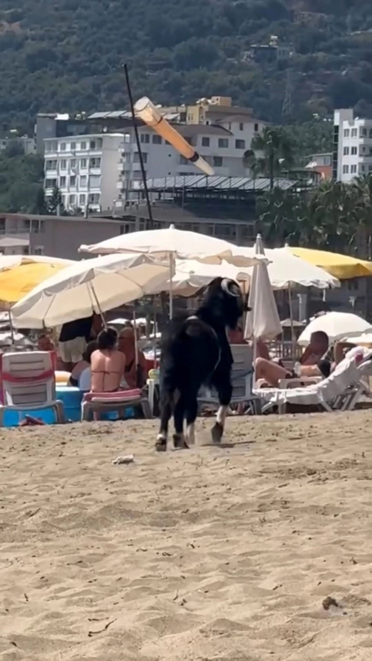 Şezlonglar ve güneşlenen tatilcilerin arasına giren keçi, sahilde bir süre dolaştı. O anlar çevrede bulunan bir vatandaş tarafından cep telefonu kamerasıyla görüntülendi.