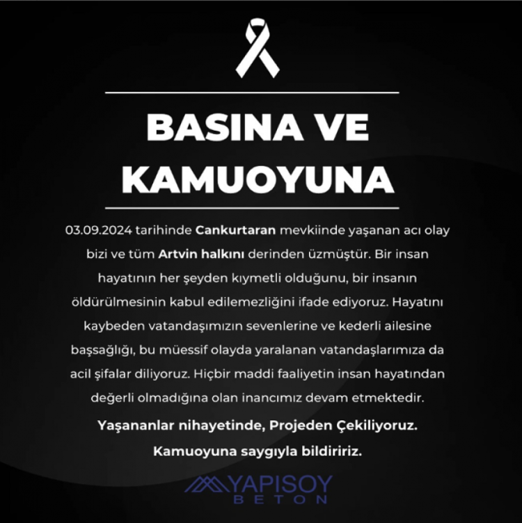 Hiç bir maddi faaliyetin insan hayatından değerli olmadığına olan inancımız devam etmektedir. Yaşananlar nihayetinde projeden çekiliyoruz."