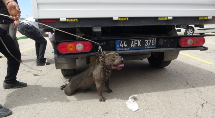Saldırgan köpek, dört kişi tarafından güçlükle zapt edilerek bir aracın arkasına bağlandı.