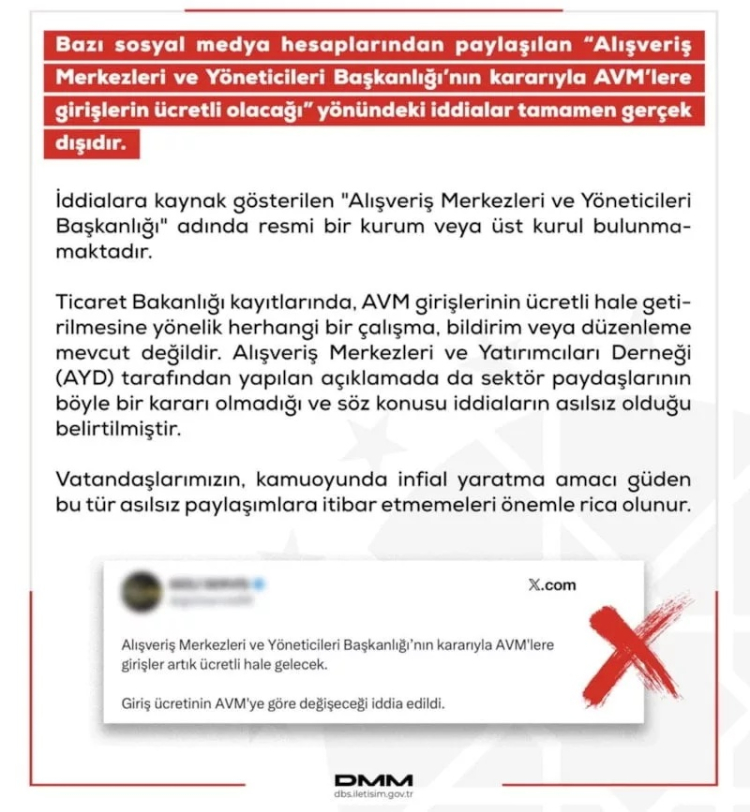 İletişim Başkanlığı Dezenformasyonla Mücadele Merkezi, "Alışveriş Merkezleri ve Yöneticileri Başkanlığı'nın kararıyla AVM'lere girişlerin ücretli olacağı" yönündeki iddiaların tamamen gerçek dışı olduğunu bildirdi.
