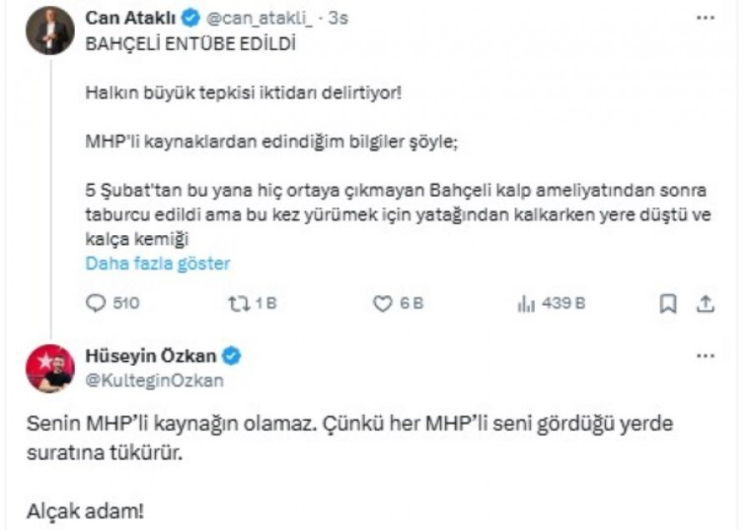 Gazeteci Can Ataklı MHP Genel Başkanı Devlet Bahçeli'nin entübe edildiğini ve bitkisel hayata girdiğini öne sürdü. MHP cephesi ise Ataklı'nın bu iddiasını sert bir dille yalanladı.