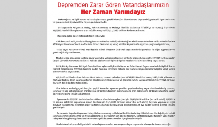 Bakan Işıkhan'ın açıklamasına göre, deprem felaketinin meydana geldiği tarihte söz konusu il ve ilçelerde faaliyet gösteren ve Hazine ve Maliye Bakanlığınca belirlenen kriterlere sahip mükelleflerden 5510 sayılı Kanun'un 4'üncü maddesinin birinci fıkrasının (a) ve (c) bentleri kapsamında sigortalı çalıştıran iş yerlerinin, 5510 sayılı Kanun'un 4'üncü maddesinin birinci fıkrasının (b) bendi kapsamındaki sigortalılar ile diğer sigortalılar ve genel sağlık sigortalılarının, mücbir sebep sona erme tarihine kadar vermekle yükümlü oldukları her türlü bilgi ve belgenin 15 Aralık 2025 tarihine kadar Sosyal Güvenlik Kurumuna verilmesi halinde söz konusu bilgi ve belgeler, yasal süresi içinde verilmiş sayılacak.