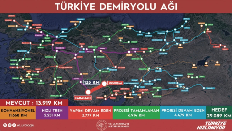 Marmara, İç Anadolu ve Akdeniz bölgeleri arasında hızlı tren bağlantısı kuran Konya-Karaman Hızlı Tren Hattı’nı 8 Ocak 2022’de hizmete açtıklarını anımsatan Bakan Uraloğlu, “Açıldığı günden bu yana yaklaşık 4 milyon yolcuya hızlı, güvenli ve konforlu ulaşım hizmeti sunduk. Şimdi bu hattın devamı olan toplam 135 kilometre uzunluğundaki Karaman-Ulukışla Hattımızı, saatte 200 kilometre hıza uygun şekilde çift hatlı, elektrikli ve sinyalli olarak inşa ediyoruz.” diye konuştu.