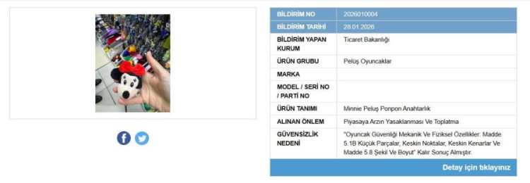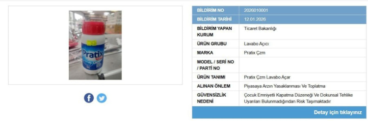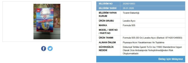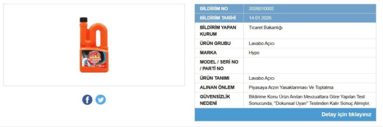 Ticaret Bakanlığı tarafından yürütülen denetim çalışmaları kapsamında Güvensiz Ürün Bilgi Sistemi (GÜBİS) üzerinden yapılan açıklamada bir ürünün kullanıcı sağlığı açısından risk taşıdığı belirtildi.