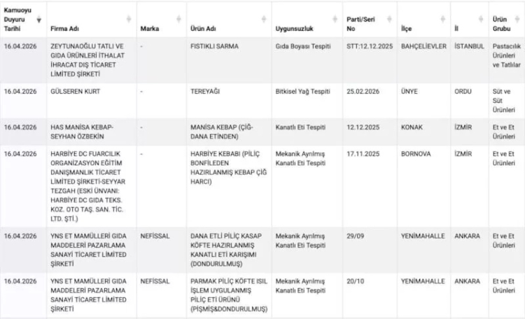 Tarım ve Orman Bakanlığı, halk sağlığını tehlikeye atan firmaları açıkladı. 16 Nisan'da yayımlanan listede İstanbul'da bir tatlı firması yer aldı. Fıstık sarmanın içinden gıda boyası çıktı.