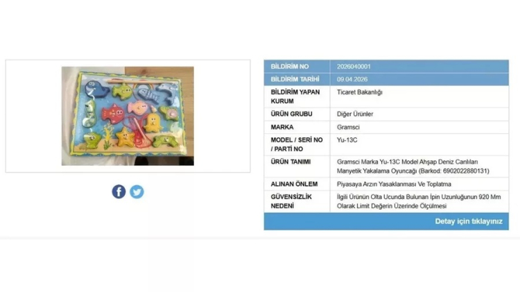 Resmi açıklamada, oyuncağın özellikle çocuklar için boğulma ve yaralanma riski taşıdığı ifade edildi. Ürünün olta ucunda bulunan ipin uzunluğunun 920 mm ölçülerek belirlenen limitlerin üzerinde olduğu ve bu durumun ciddi tehlike oluşturduğu kaydedildi.