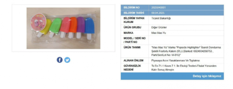 Ticaret Bakanlığı, 'Güvensiz Ürün Bilgi Sistemi' üzerinden sağlık riski barındıran yeni ürünleri kamuoyuna açıkladı. İlgili listede bir adet kırtasiye ürününün satışı yasaklanırken, piyasadan da toplatılmasına karar verildi.