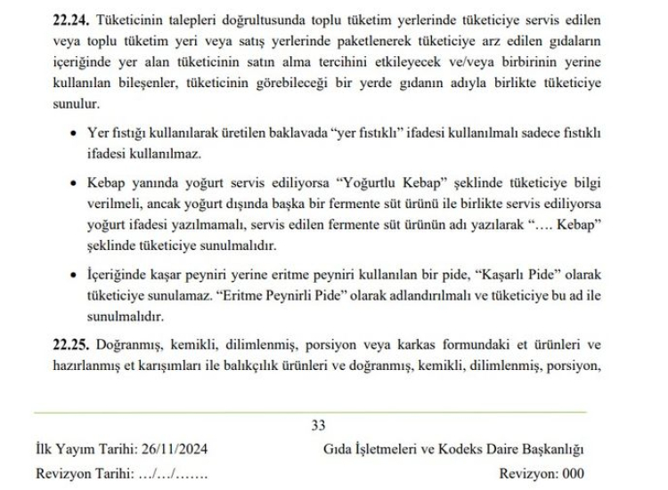 Açıklamada "Tüketicinin talepleri doğrultusunda toplu tüketim yerlerinde tüketiciye servis edilen veya toplu tüketim yeri veya satış yerlerinde paketlenerek tüketiciye arz edilen gıdaların içeriğinde yer alan tüketicinin satın alma tercihini etkileyecek ve/veya birbirinin yerine kullanılan bileşenler, tüketicinin görebileceği bir yerde gıdanın adıyla birlikte tüketiciye sunulur" denilirken "İçeriğinde kaşar peyniri yerine eritme peyniri kullanılan bir pide, “Kaşarlı Pide” olarak tüketiciye sunulamaz. “Eritme Peynirli Pide” olarak adlandırılmalı ve tüketiciye bu ad ile sunulmalıdır." ifadeleri kullanıldı.