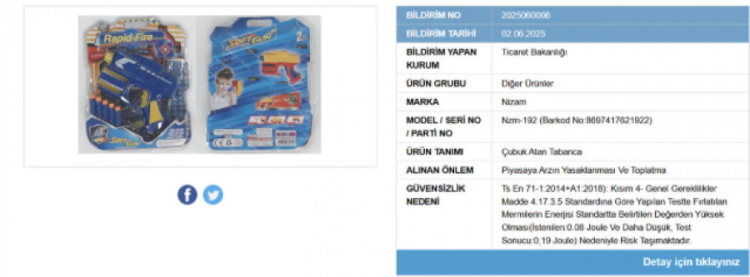 Nizam markasına ait "Çubuk Atan Tabanca", yapılan testlerde fırlattığı mermilerin enerjisinin mevzuatta belirlenen 0.08 joule sınırını aşarak 0.19 joule'ye ulaştığı tespit edildi. Oyuncak, potansiyel yaralanma riski taşıdığı gerekçesiyle güvensiz bulundu.
