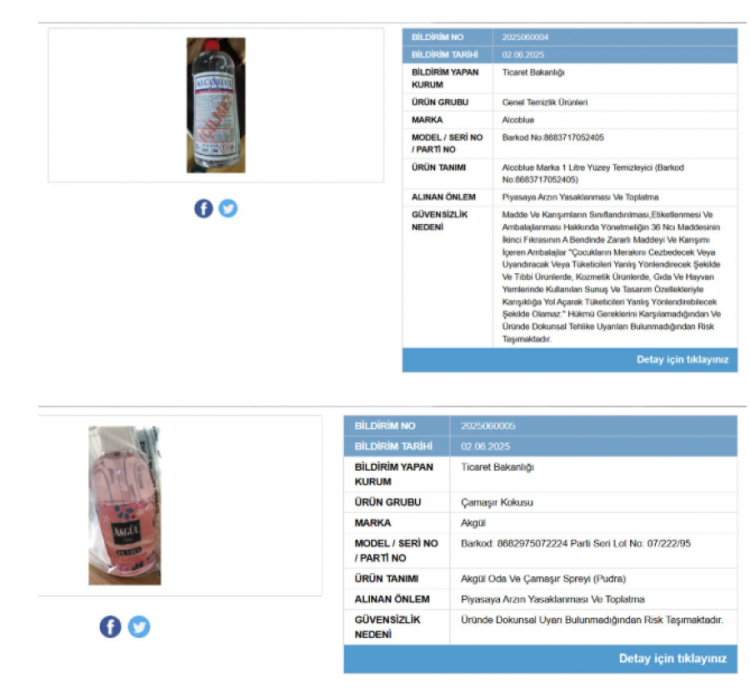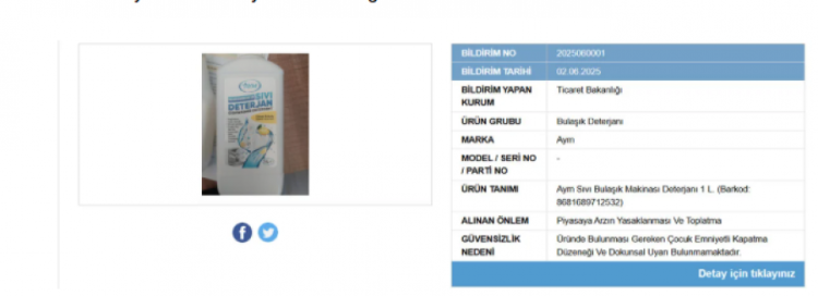 Ticaret Bakanlığı, sağlık açısından tehlike oluşturan ürünleri ifşa ettiği "Güvensiz Ürün Bilgi Sistemi"ni güncelledi. Çocuk giyimi, oyuncak ve temizlik malzemeleri kategorisindeki 6 ürün yasaklandı ve piyasadan toplatılmalarına karar verildi. Ürünlerin arasında AYM marka bulaşık deterjanın da yer alması dikkat çekti.