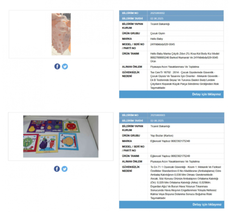 Hello Baby markasına ait kız bebek zıbın takımının baskılarındaki parçaların koparak yutulma riski oluşturduğu, Eğlenceli Yapboz isimli karton oyuncakta ise ambalajın hava akışını engelleyecek incelikte olduğu belirlendi. Her iki ürün için de toplatılmasına karar verildi.
