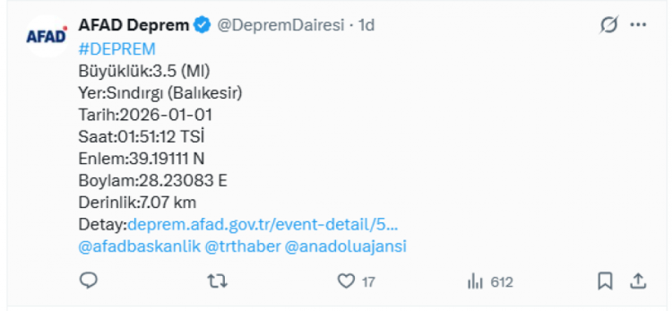 AFAD açıklamasına göre Balıkesir Sındırgı'da saat 01.51'de 3,5 büyüklüğünde bir deprem meydana geldi.