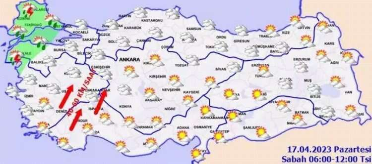 KUVVETLİ YAĞIŞ UYARISI: Yağışların; öğle saatlerinden sonra Çanakkale, Edirne, Kırklareli ve Tekirdağ çevrelerinde yerel kuvvetli olması beklendiğinden ani sel, su baskını, yıldırım, yerel dolu yağışı ve kuvvetli rüzgâr gibi olumsuzluklara karşı dikkatli ve tedbirli olunması gerekmektedir.
